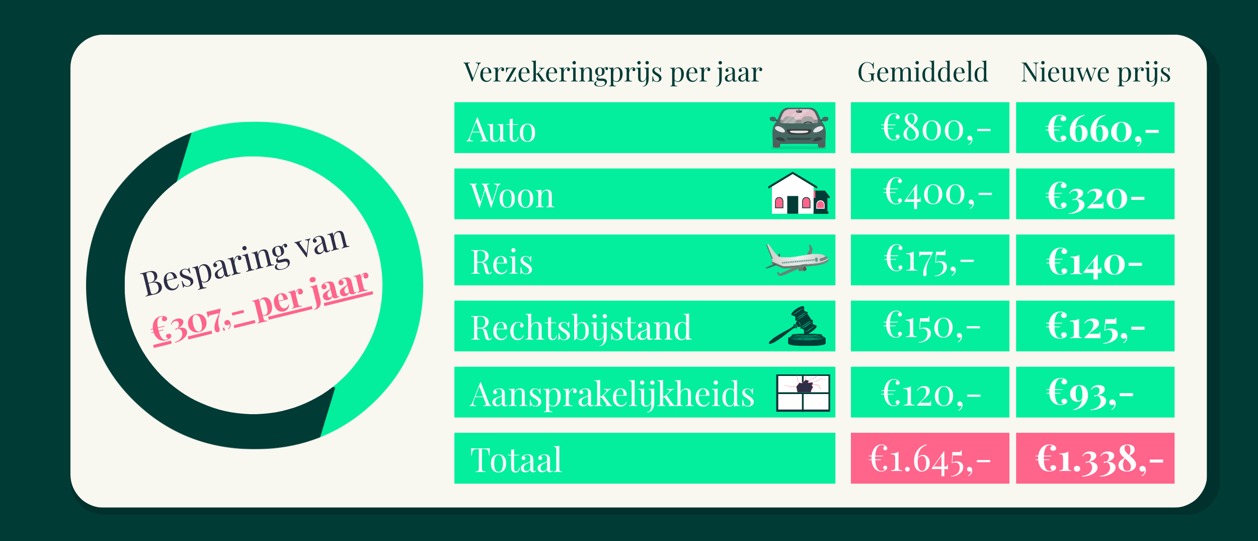 Veel klanten besparen honderden euro’s per jaar op hun verzekeringen. Dit overzicht laat zien hoe een gemiddeld huishouden met vijf veelvoorkomende verzekeringen uitkomt op een besparing van €307 per jaar